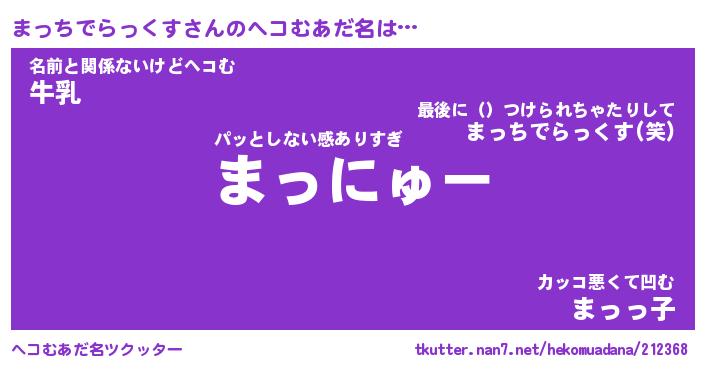 | 男性向けラノベタイトル風あだ名 | 『まっちでらっくすの憂鬱』 |