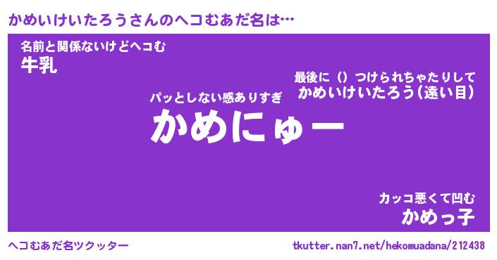 | 男性向けラノベタイトル風あだ名 | 『かめいけいたろうの憂鬱』 |