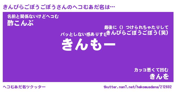 | 男性向けラノベタイトル風あだ名 | 『キンピラゴボウゴボウアートオンライン』 |