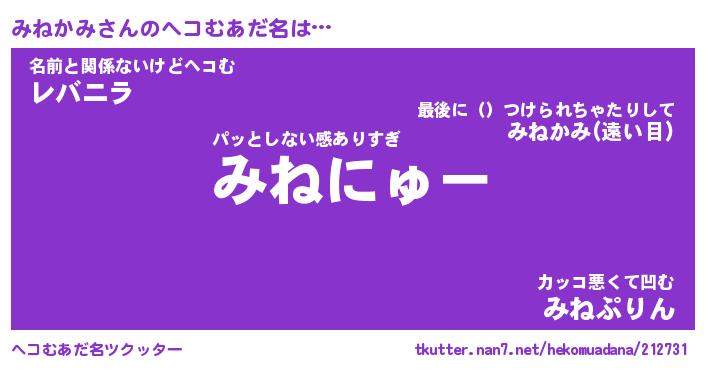 | 意味不明あだ名 | 『ペロリンみねかみ』『永久保存みねかみ』 |