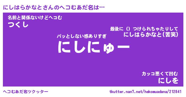 | 恥ずかしいあだ名 | 『プリティーにしはらかなと』『にしちん』 |