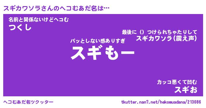 | ヒーロー風カッコイイあだ名 | 『スーパースギカワソラ』『銀牙騎士スギ』 |