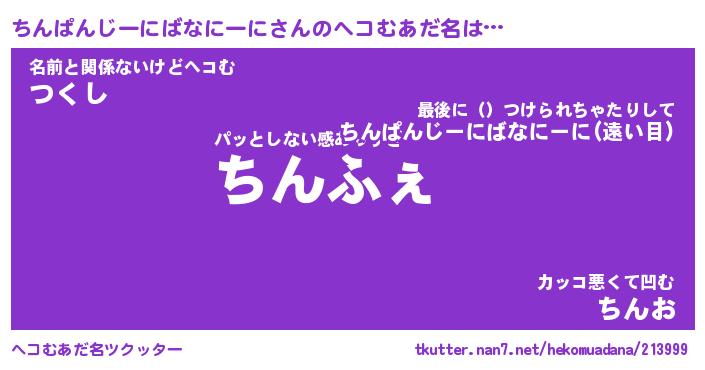| 男性向けラノベタイトル風あだ名 | 『ちんぱんじーにばなにーにの憂鬱』 |