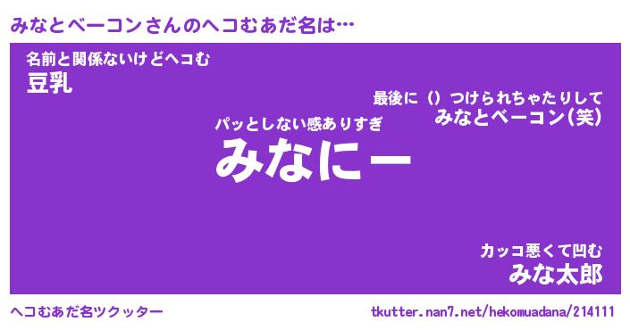 | 男性向けラノベタイトル風あだ名 | 『ミナトベーコンアートオンライン』 |