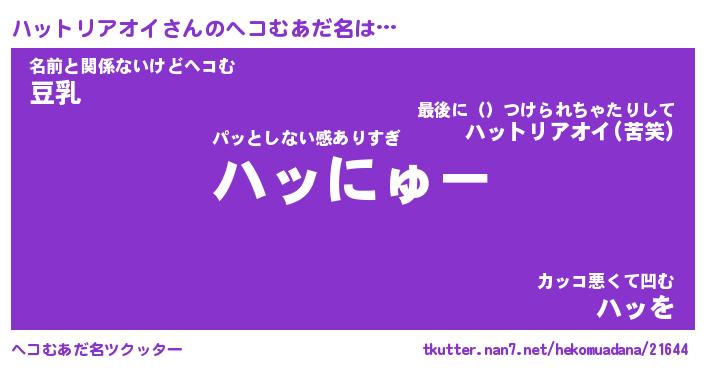| 男性向けラノベタイトル風あだ名 | 『ハットリアオイアートオンライン』 |