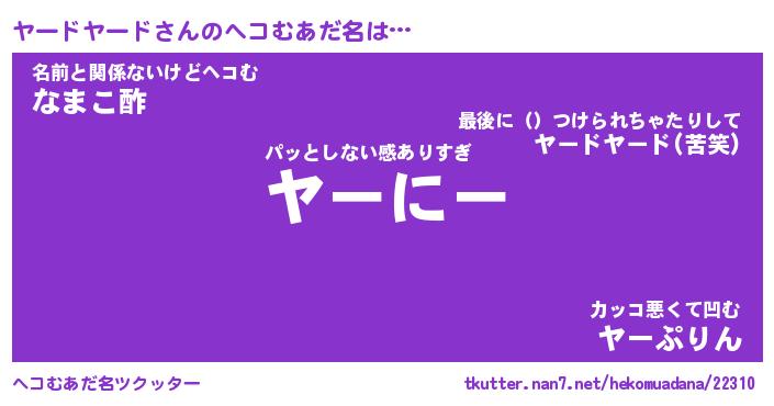 | ヒーロー風カッコイイあだ名 | 『スーパーヤードヤード』『炎刃騎士ヤー』 |