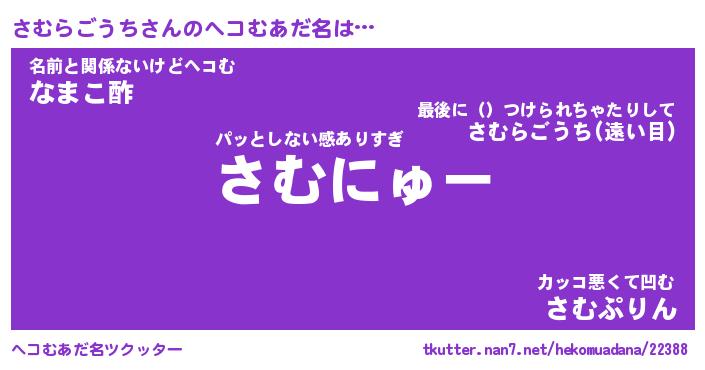 | 男性向けラノベタイトル風あだ名 | 『さむらごうちの憂鬱』 |
