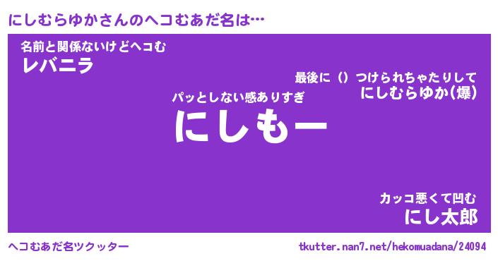| ヒーロー風カッコイイあだ名 | 『スーパーニシムラユカ』『魔戒騎士ニシ』 |