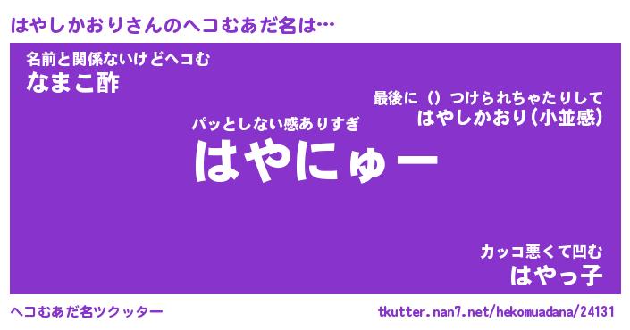 | 男性向けラノベタイトル風あだ名 | 『ハヤシカオリアートオンライン』 |