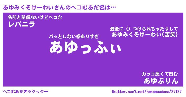 | 伝説のあだ名 | 『伝説のスナイパーあゆみくそけーわい』 |