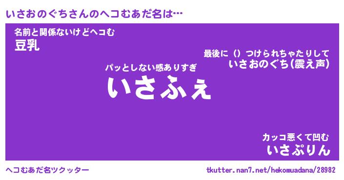 | 男性向けラノベタイトル風あだ名 | 『いさおのぐちの憂鬱』 |