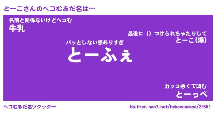 | 意味不明あだ名 | 『ペロリンとーこ』『とーこフォーエバー』 |