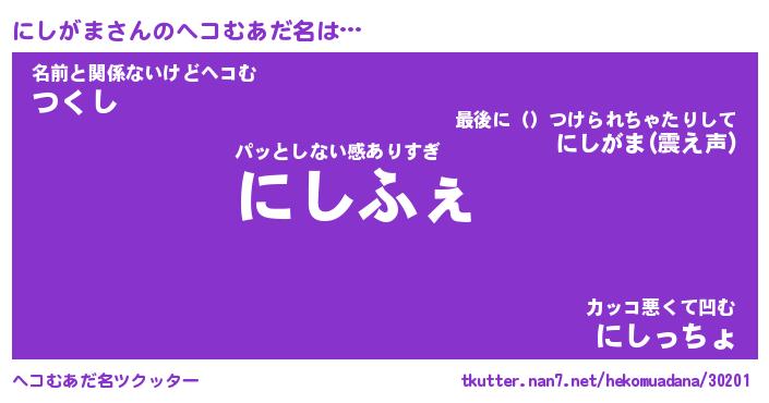 | ファンタジー風あだ名 | 『ニシフェル』『エターナルニシガマー』 |