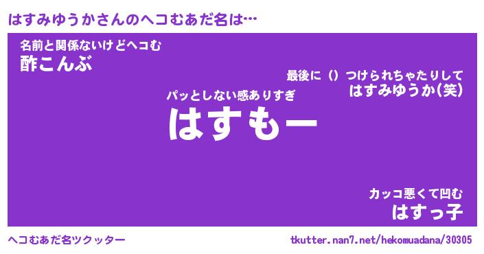 | 恥ずかしいあだ名 | 『プリティーはすみゆうか』『はすっちょ』 |