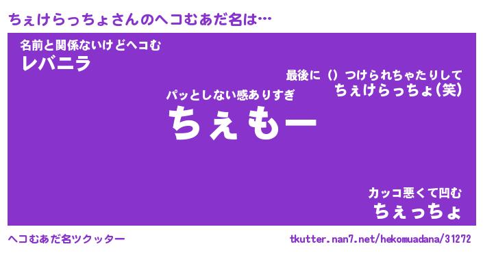 | 女子向けラノベタイトル風あだ名 | 『(仮)ちぇけらっちょのやんごとなき事情』 |