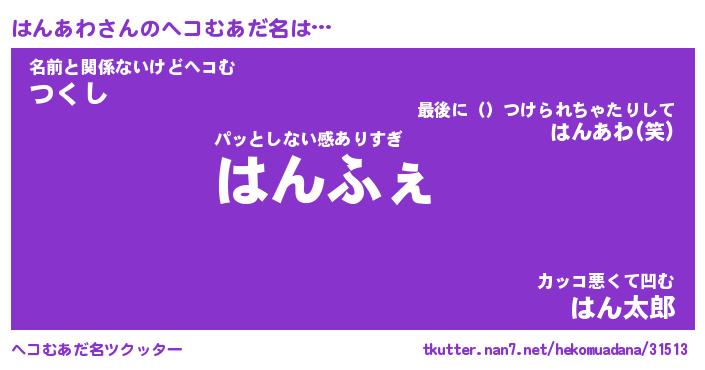 | 2回繰り返すあだ名 | 『はんはん』『ははんん』『かんかん』 |