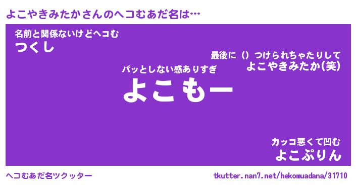 | 恥ずかしいあだ名 | 『プリティーよこやきみたか』『よこちん』 |