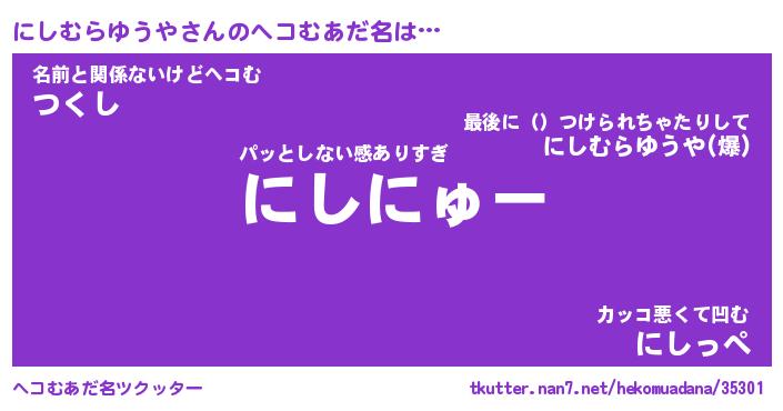| 恥ずかしいあだ名 | 『プリティーにしむらゆうや』『にしちん』 |