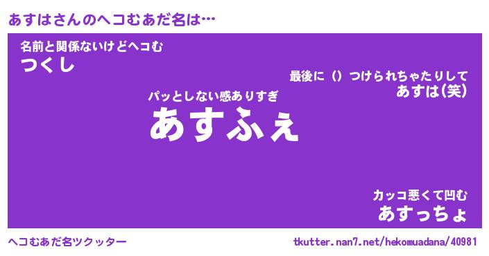 | 意味不明あだ名 | 『ペロリンあすは』『あすはフォーエバー』 |