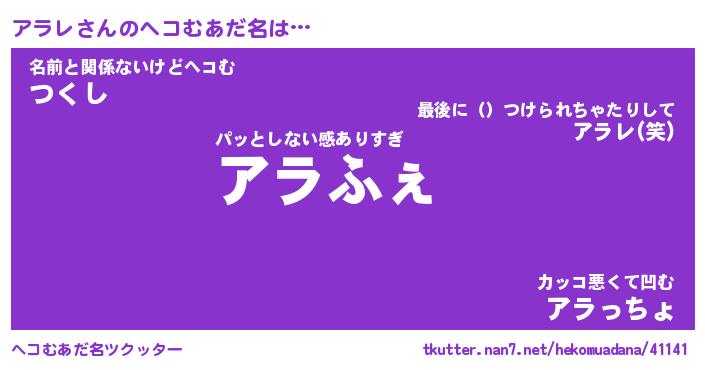 | 意味不明あだ名 | 『ペロリンアラレ』『アラレフォーエバー』 |