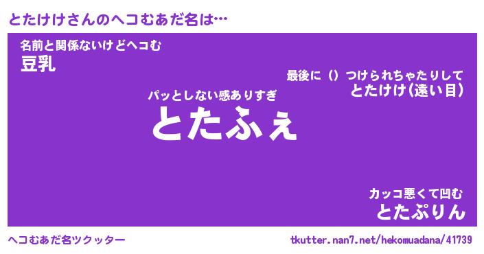 | 意味不明あだ名 | 『ペロリンとたけけ』『永久保存とたけけ』 |