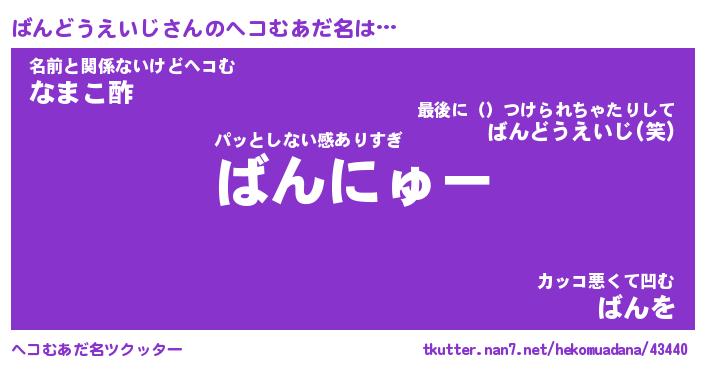 | 恥ずかしいあだ名 | 『プリティーばんどうえいじ』『ばんちん』 |