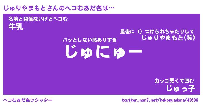 | 恥ずかしいあだ名 | 『プリティーじゅりやまもと』『じゅちん』 |