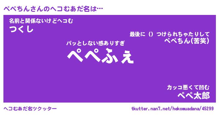 | 男性向けラノベタイトル風あだ名 | 『ぺぺちんの憂鬱』 |