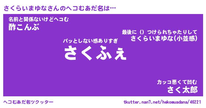 | 恥ずかしいあだ名 | 『プリティーさくらいまゆな』『さくちん』 |