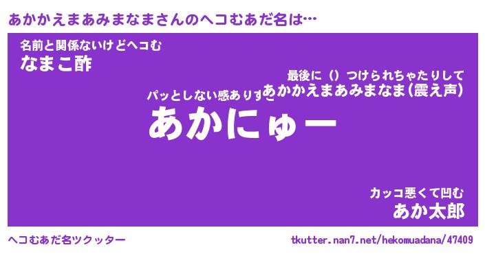 | 男性向けラノベタイトル風あだ名 | 『アカカエマアミマナマアートオンライン』 |