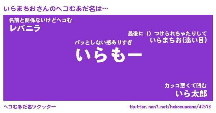 | 男性向けラノベタイトル風あだ名 | 『いらまちおの憂鬱』 |