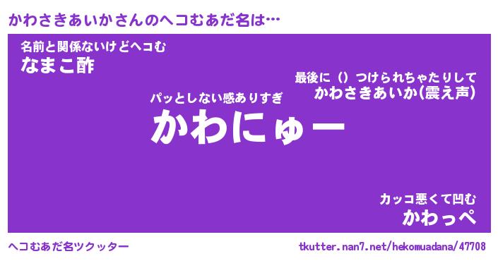 | 男性向けラノベタイトル風あだ名 | 『カワサキアイカアートオンライン』 |