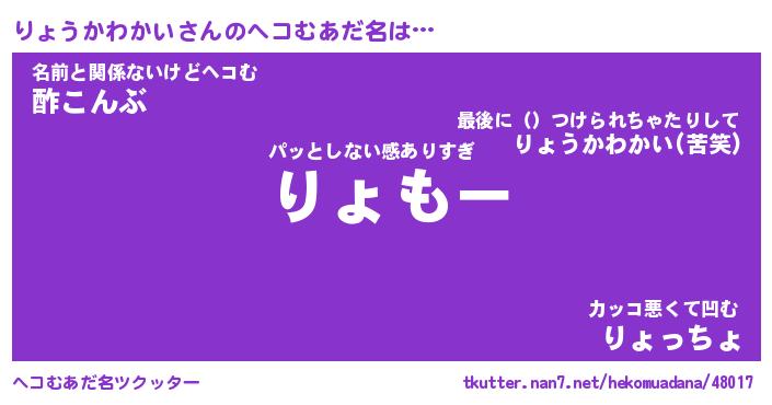 | 男性向けラノベタイトル風あだ名 | 『りょうかわかいの憂鬱』 |