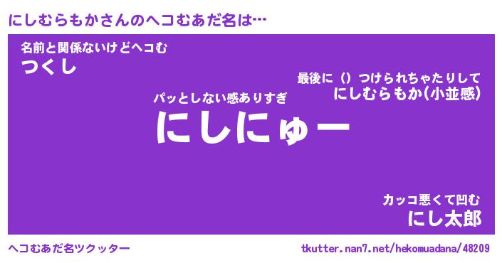 恥ずかしいあだ名 | 『プリティーにしむらもか』『にしっちょ』 |