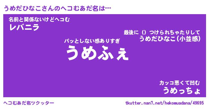 | ヒーロー風カッコイイあだ名 | 『スーパーウメダヒナコ』『天弓騎士ウメ』 |
