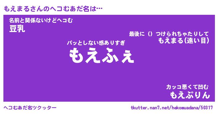 | 意味不明あだ名 | 『ペロリンもえまる』『永久保存もえまる』 |