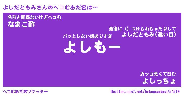 | ヒーロー風カッコイイあだ名 | 『スーパーヨシダトモミ』『魔戒騎士ヨシ』 |
