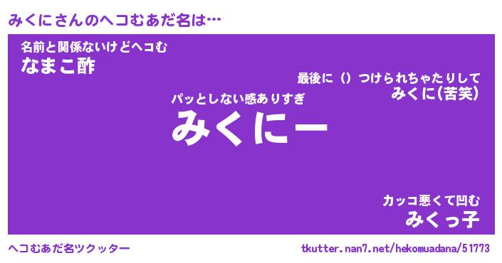 | 2回繰り返すあだ名 | 『みくみく』『みみくく』『ぬるぬる』 |