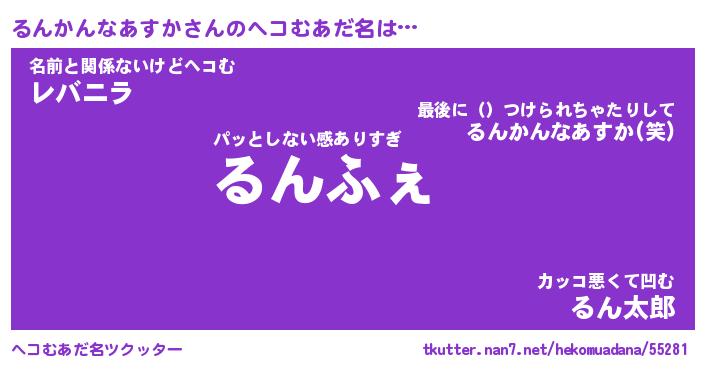 | 女子向けラノベタイトル風あだ名 | 『(仮)るんかんなあすかのやんごとなき事情』 |