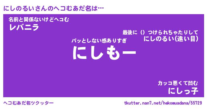 | 男性向けラノベタイトル風あだ名 | 『にしのるいの憂鬱』 |