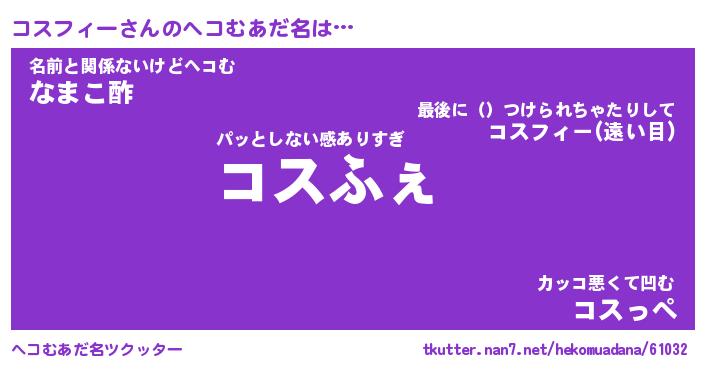 | 男性向けラノベタイトル風あだ名 | 『コスフィーの憂鬱』 |