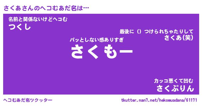 | 意味不明あだ名 | 『ペロリンさくあ』『さくあフォーエバー』 |