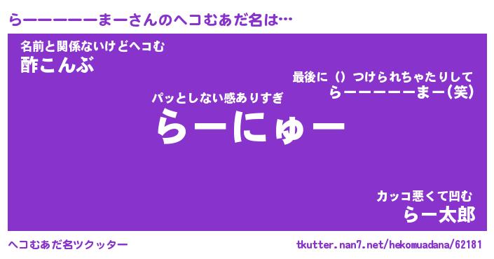 | 男性向けラノベタイトル風あだ名 | 『らーーーーーまーの憂鬱』 |