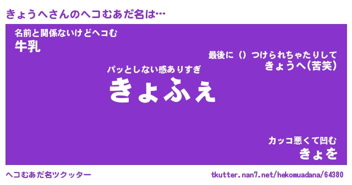 | 意味不明あだ名 | 『ペロリンきょうへ』『永久保存きょうへ』 |