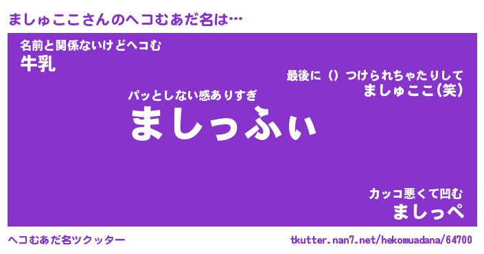 | 男性向けラノベタイトル風あだ名 | 『ましゅここの憂鬱』 |