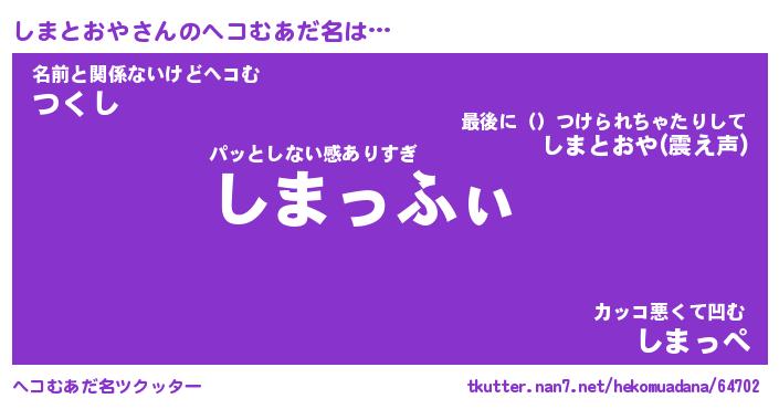 | 男性向けラノベタイトル風あだ名 | 『しまとおやの憂鬱』 |