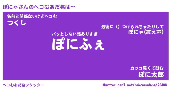 | 男性向けラノベタイトル風あだ名 | 『ぽにゃの憂鬱』 |
