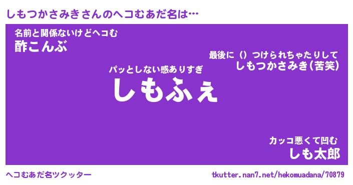 | 男性向けラノベタイトル風あだ名 | 『しもつかさみきの憂鬱』 |