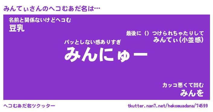 | 意味不明あだ名 | 『ペロリンみんてぃ』『永久保存みんてぃ』 |