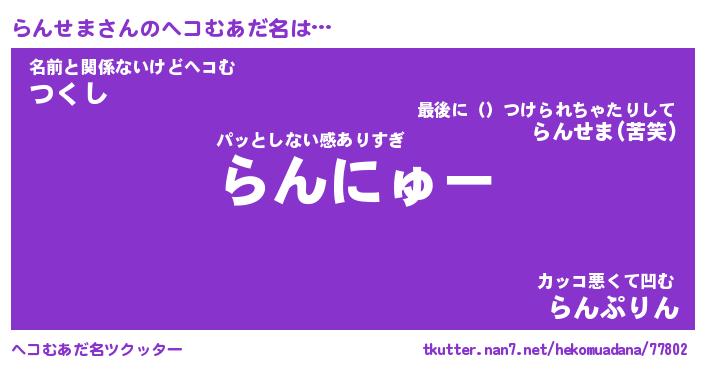 | 意味不明あだ名 | 『ペロリンらんせま』『永久保存らんせま』 |